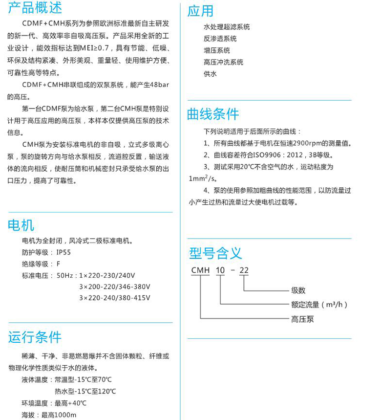 產(chǎn)品說明:cdmf+cmh系列為參照歐洲標(biāo)準(zhǔn)自主研發(fā)的新一代、高效率非自吸高壓泵。產(chǎn)品采用全新的工業(yè)設(shè)計(jì),能效指標(biāo)達(dá)到mei≥0.7,具有節(jié)能、低噪、環(huán)保及結(jié)構(gòu)緊湊、外形美觀、重量輕、使用維護(hù)方便、可靠性高等特點(diǎn)。