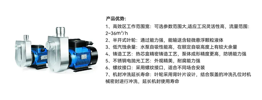 NZXF系列小型不銹鋼自吸泵是在硏究國(guó)內(nèi)外同類產(chǎn)品的基礎(chǔ)上,結(jié)合我司先進(jìn)優(yōu)秀的水力模型開發(fā)的一種結(jié)構(gòu)新穎、性能卓越的產(chǎn)品。該泵與目前市面同類產(chǎn)品相比具有自吸性能好,有一定排污能力,結(jié)構(gòu)簡(jiǎn)單緊湊,外觀小巧精美,特殊結(jié)構(gòu)能保證機(jī)械密封的可靠性和延長(zhǎng)其運(yùn)行壽命,各項(xiàng)性能指標(biāo)在國(guó)家實(shí)驗(yàn)室測(cè)試合格,在國(guó)內(nèi)處于領(lǐng)先狀態(tài),在家用、工農(nóng) 業(yè)具有廣泛前景。